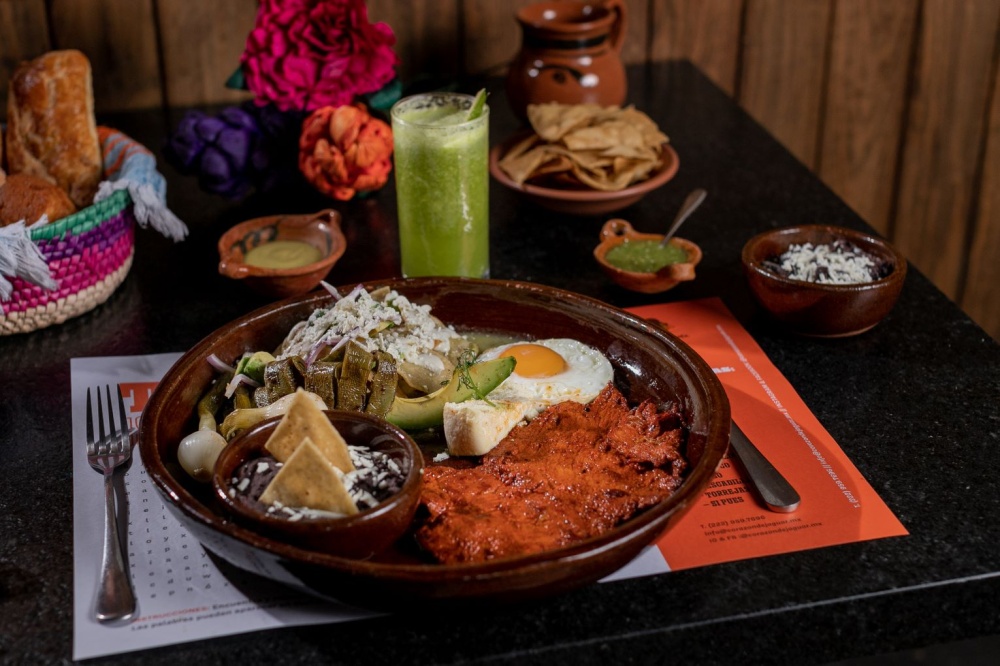 ¡El más completo! 160 g de cecina o carne enchilada o arrachera, acompañado de chilaquiles rojos o verdes, huevo estrellado, nopal asado, cebollitas cambray asada